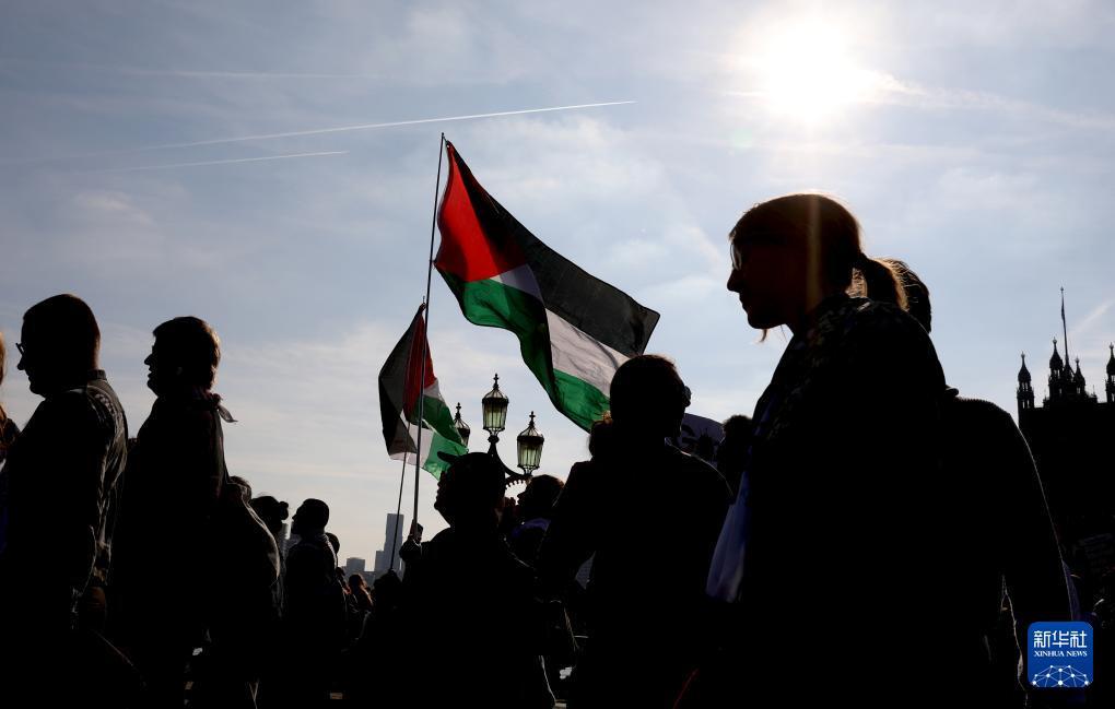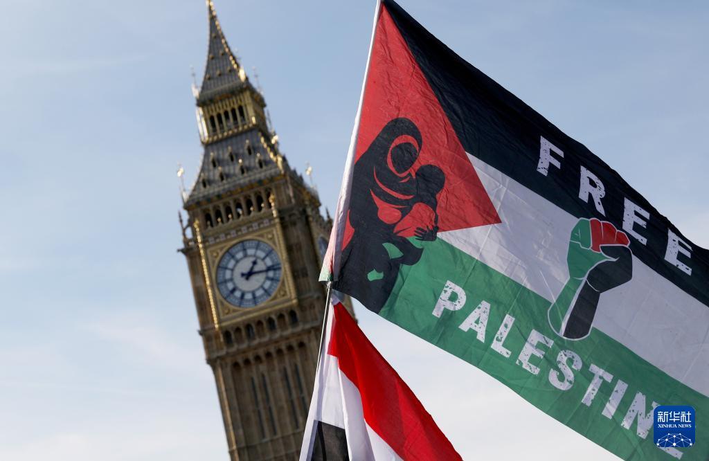 10月11日,在英國倫敦,游行隊伍經過大本鐘。 當日,英國民眾在倫敦舉行游行活動聲援巴勒斯坦,呼吁加沙實現持久和平。 新華社記者 李穎 攝