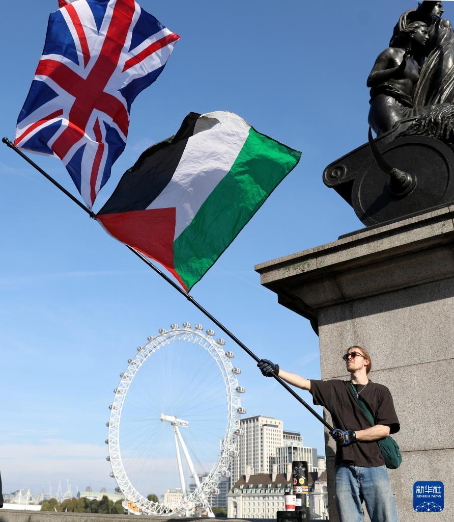 10月11日,一名男子在英國倫敦眼附近參加游行活動。 當日,英國民眾在倫敦舉行游行活動聲援巴勒斯坦,呼吁加沙實現持久和平。 新華社記者 李穎 攝
