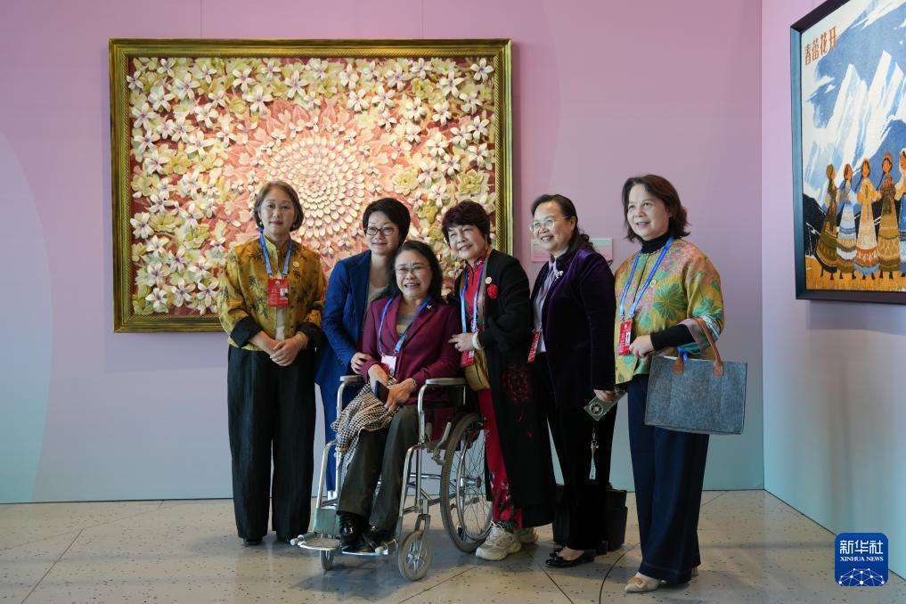 10月13日,參會的張海迪等嘉賓在全球婦女峰會女性主題特展"華韻承芳·非遺共賞"上合影。 10月13日,全球婦女峰會在北京舉行。 新華社記者 胥冰潔 攝