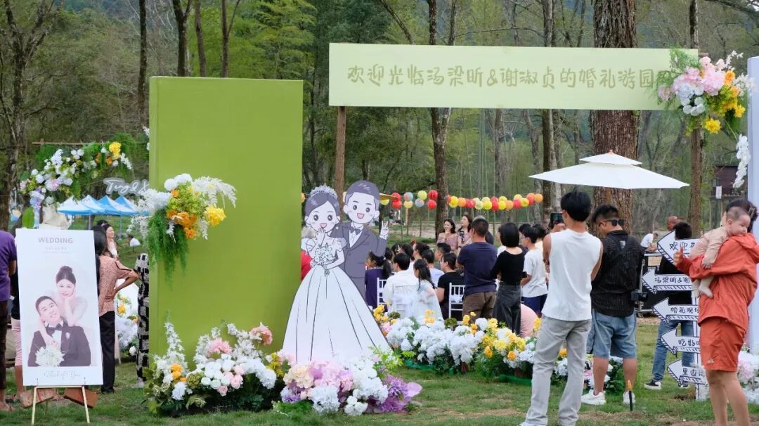 婚禮現場 這場婚禮沒有華麗的商業布景,卻處處透著原生態的浪漫:孩子們沿著綠道追逐嬉戲,長輩們坐在休閑凳上閑話家常。新人坦言:“選擇在溪林里濕地公園辦婚禮,既是想讓幸福沾著自然的‘煙火氣’,也是受近年來家鄉‘文旅興村’氛圍的感染,這讓我們的婚禮更有記憶點。”
