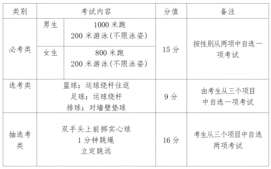 近日 漳州、寧德、泉州 確定2026年體育中考項目 具體內容一起來看 ↓↓↓ 漳州市 11月4日,2026年漳州市初中畢業升學體育考試,抽選考類測試項目抽簽結果公布: 抽選考類六選三是:50米跑、1分鐘跳繩、1分鐘仰臥起坐。考生可從三個項目中自選2項考試。 現行的籃球、足球、排球“三大球”抽考項目改為選考,考生可從三個項目中自選1項考試。 在考試內容方面,體育與健康基本知識考試將調整為日常檢測,原中考分值調整至運動技能測試。 中考體育分值結構上,保持總分值40分不變,具體分配為:必考類15分(1000米/800米跑、200米游泳)、選考類9分(“三大球”)、抽選考類16分(50米跑、立定跳遠、1分鐘跳繩、引體向上/斜身引體、雙手頭上前擲實心球、1分鐘仰臥起坐)。 寧德市 11月4日,寧德市教育局組織開展了2026年體育中考身體素質與運動能力測試抽選考項目現場抽選活動,并發布《關于寧德市2026年體育中考抽選考項目抽選結果的通知》,確定2026年寧德市體育中考抽選考項目。 此次抽選考類從六項:50米跑、立定跳遠、1分鐘跳繩、引體向上(男)/斜身引體(女)、雙手頭上前擲實心球、1分鐘仰臥起坐中隨機抽選三項。 經現場公開隨機抽選,最終確定: 抽選考項目為:50米跑、1分鐘跳繩、1分鐘仰臥起坐。(考生從這三個項目中自選兩項進行考試) 必考類項目為:1000米(男)/800米(女),200米游泳(不限泳姿),考生根據性別自行選擇一項考試。 選考類項目為:籃球:運球繞桿往返、足球:運球繞桿、排球:對墻壁墊球,由考生從三個項目中自選一項考試。 考試分值