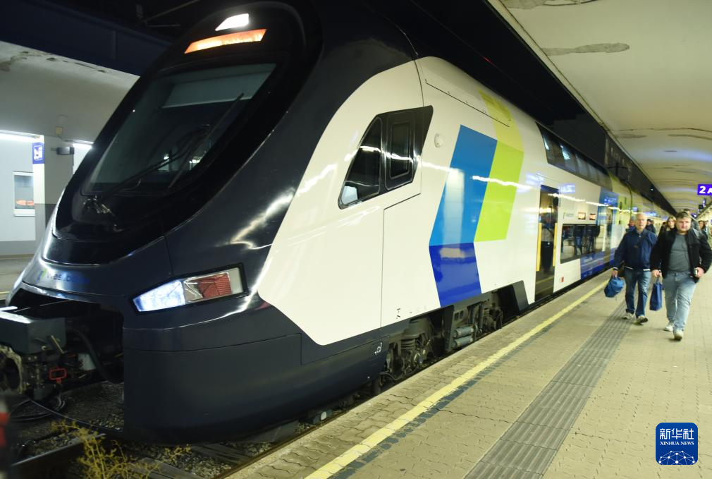 這是11月3日在奧地利維也納拍攝的由中國中車株洲電力機車有限公司生產的雙層列車。 由中國企業制造的雙層列車日前在奧地利首都維也納亮相,將用于維也納與薩爾茨堡兩座城市間客運鐵路運營。這是中國制造雙層列車首次正式投入奧地利客運鐵路系統。 新華社記者 賀燦鈴 攝