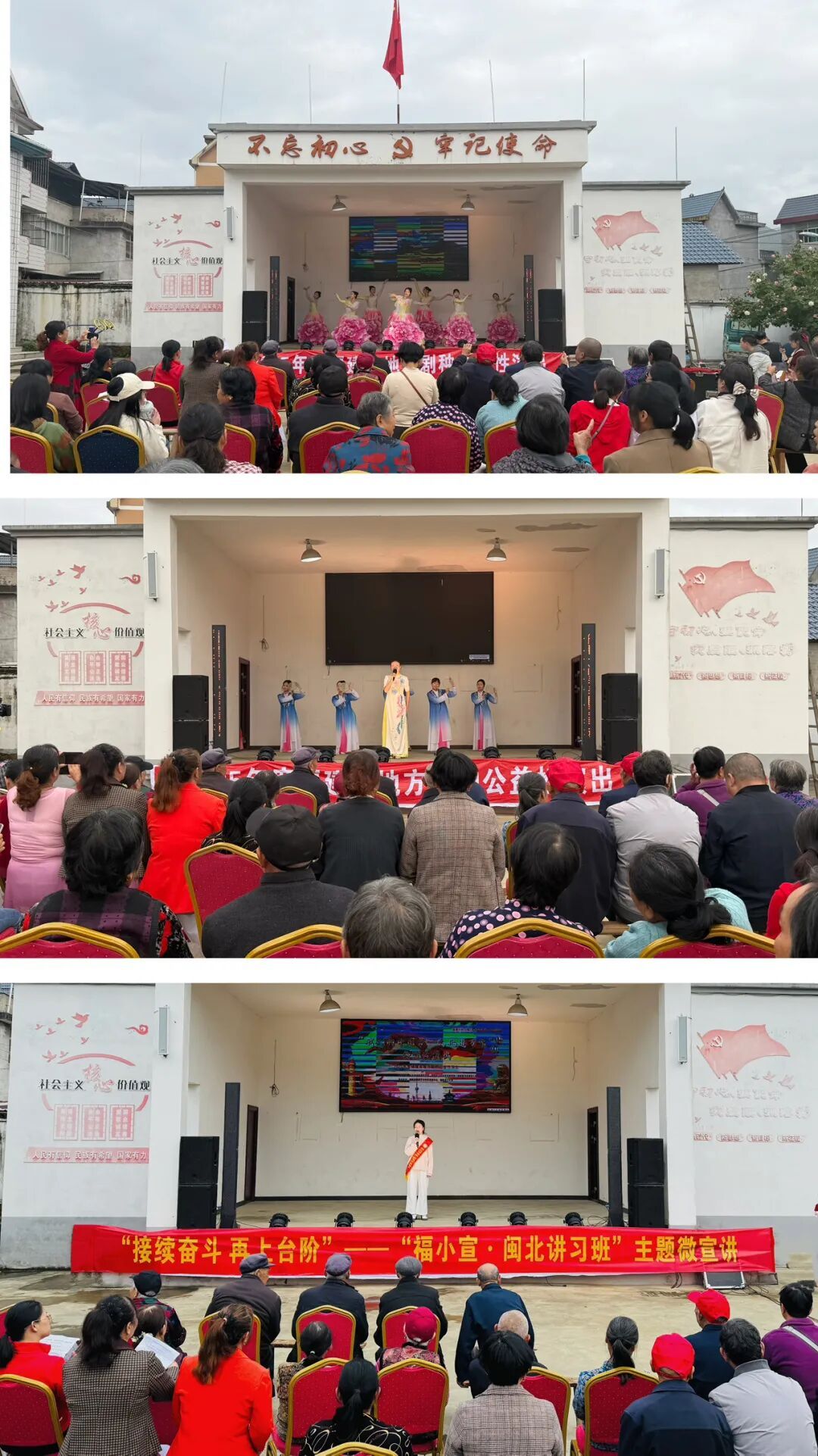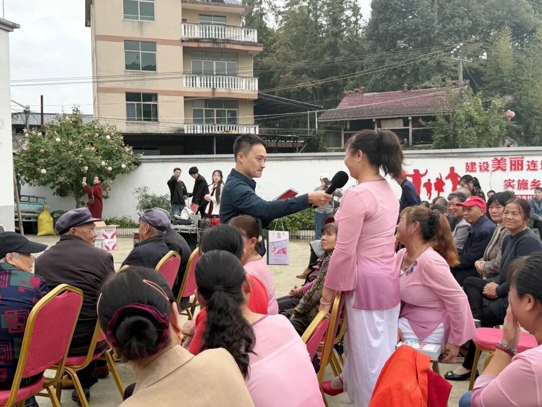 活動現場 活動在熱情洋溢的舞蹈《花開中國》中拉開序幕。隨后,韻味悠長的贛劇表演唱《夢回浦城》帶領觀眾領略了浦城深厚的歷史文化底蘊。微宣講環節,宣講員劉夢瑤帶來的《一粒米的故事》,講述了浦城作為“福建糧倉”的耕耘與收獲,展現了新時代農業農村發展的勃勃生機;宣講員黃丹寧分享的《大游村的蝶變》,則生動描繪了鄉村振興戰略下,一個村莊如何舊貌換新顏的美麗畫卷;音樂快板《曬家風·樹新風》以明快的節奏、朗朗上口的詞句,生動展現了新時代浦城人民傳承優良家風、弘揚文明新風的生動實踐……活動最后在精彩的非遺表演贛劇表演唱《說唱浦城》中圓滿落幕。 為了讓理論宣講更接地氣、更具實效,活動現場還設置了互動交流環節。主持人圍繞黨的二十屆四中全會精神進行現場提問,村民們踴躍搶答,氣氛熱烈,答對的觀眾還獲得了精心準備的小禮品。